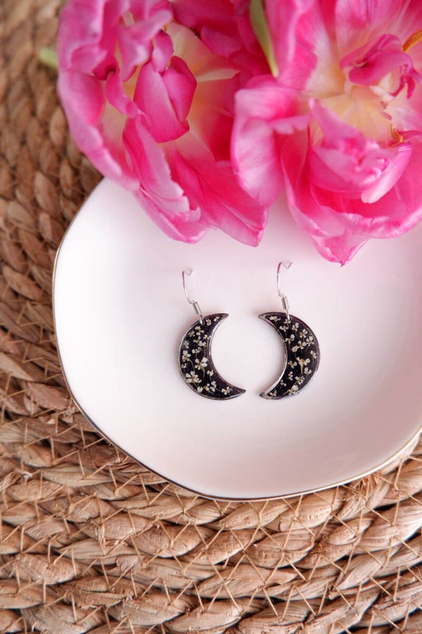 Ajoutez une touche chic et élégante avec nos boucles d'oreilles en forme de lune, avec de la résine remplie de paillettes noires et de mini fleurs blanches !