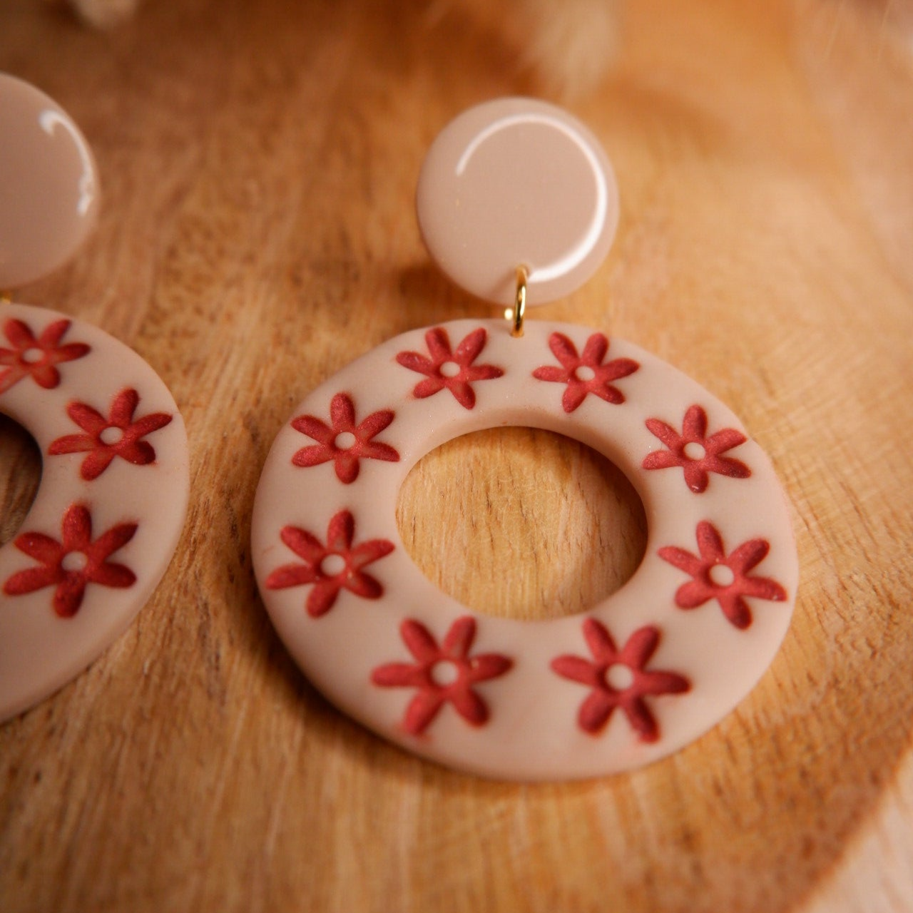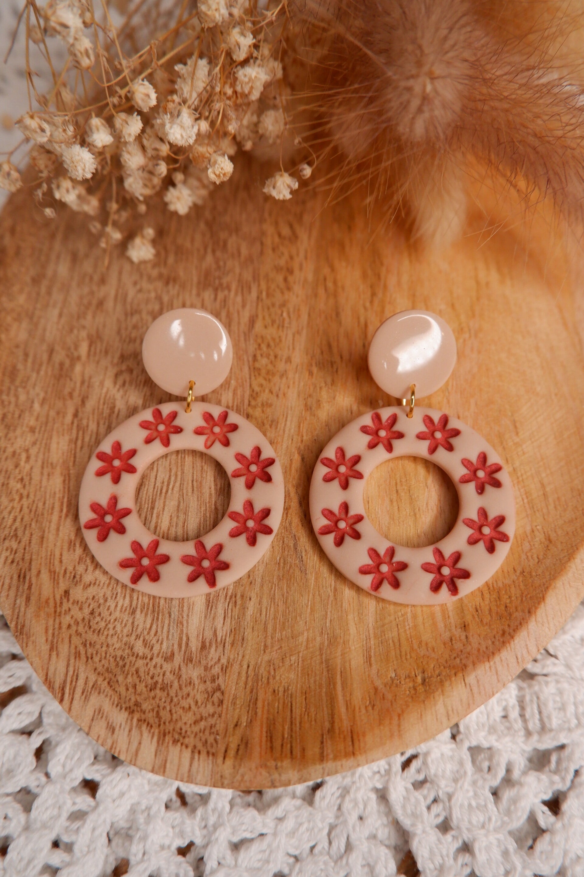 🔵 Design Élégant : Cercles superposés et fleurs en rouge brique pour un look raffiné.